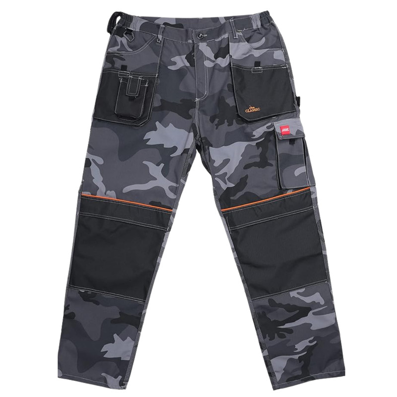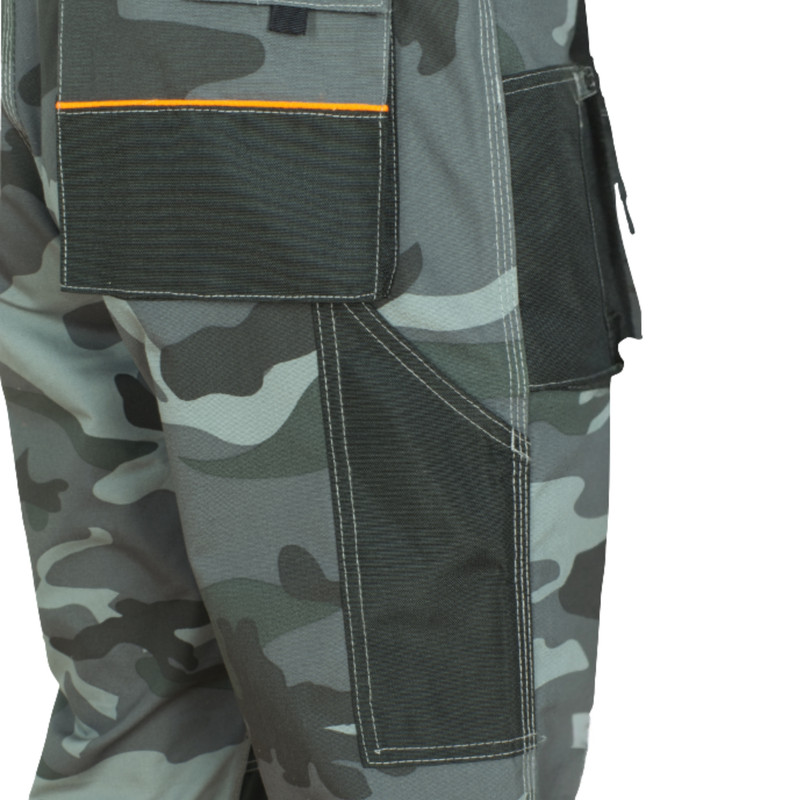 The CLASSIC CAMOU Work Trousers maintain their shape, colour, and functionality even after extensive use and washing. Available in a grey-black camouflage pattern with orange accents, they provide both practicality and style.