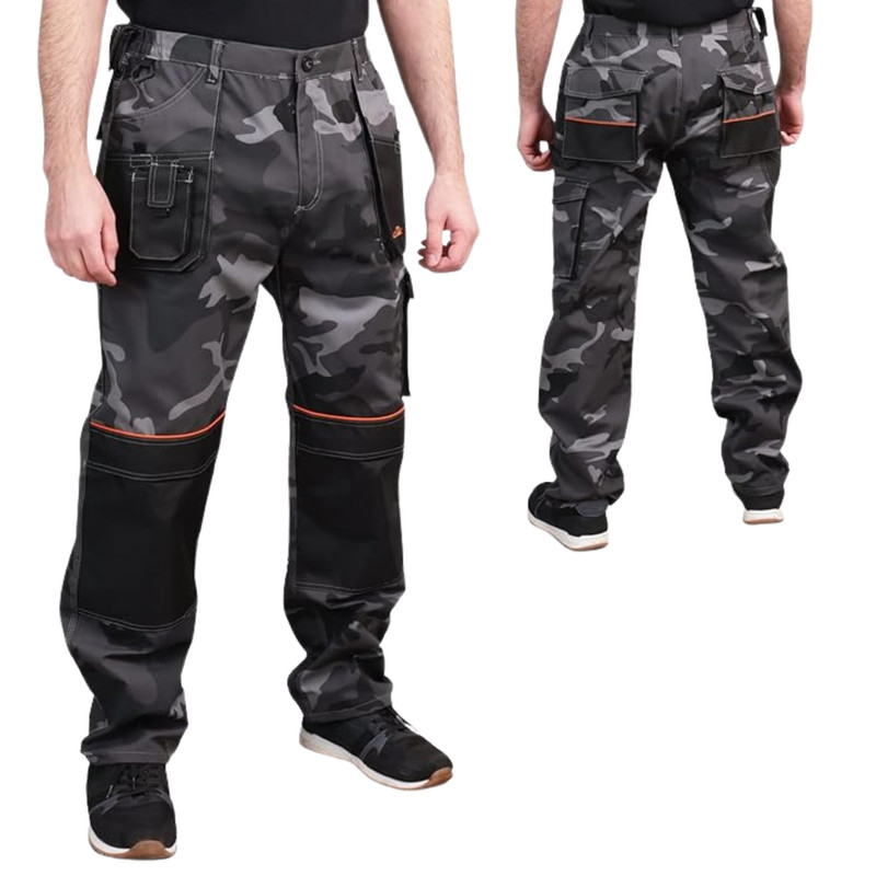 The CLASSIC CAMOU Work Trousers offer durability, comfort, and style with a camouflage pattern and orange accents. Featuring reinforced knee pockets, multiple functional pockets, and an adjustable waist, they are perfect for demanding work environments.
